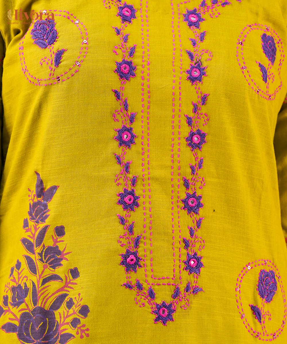 A soft lemon base adorned with purple and floral prints. Purple Gleam blends comfort with charm. Its airy fabric and graceful design make it perfect for day wear or evening elegance.