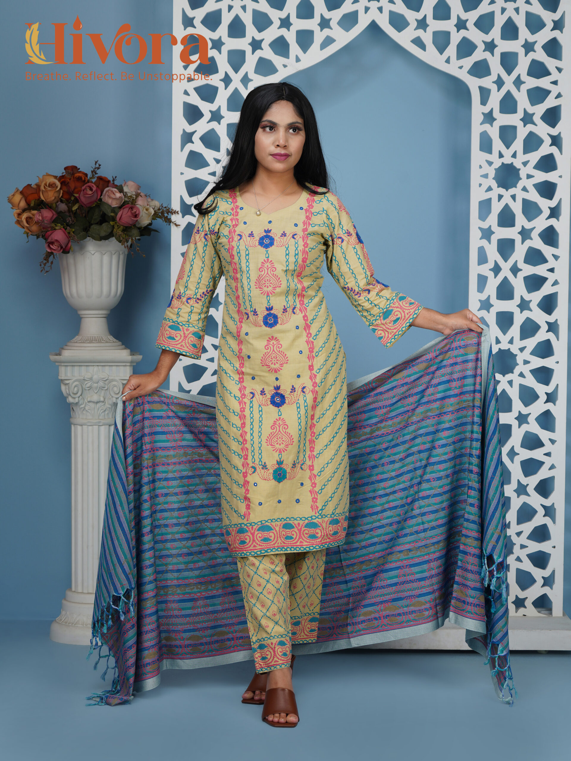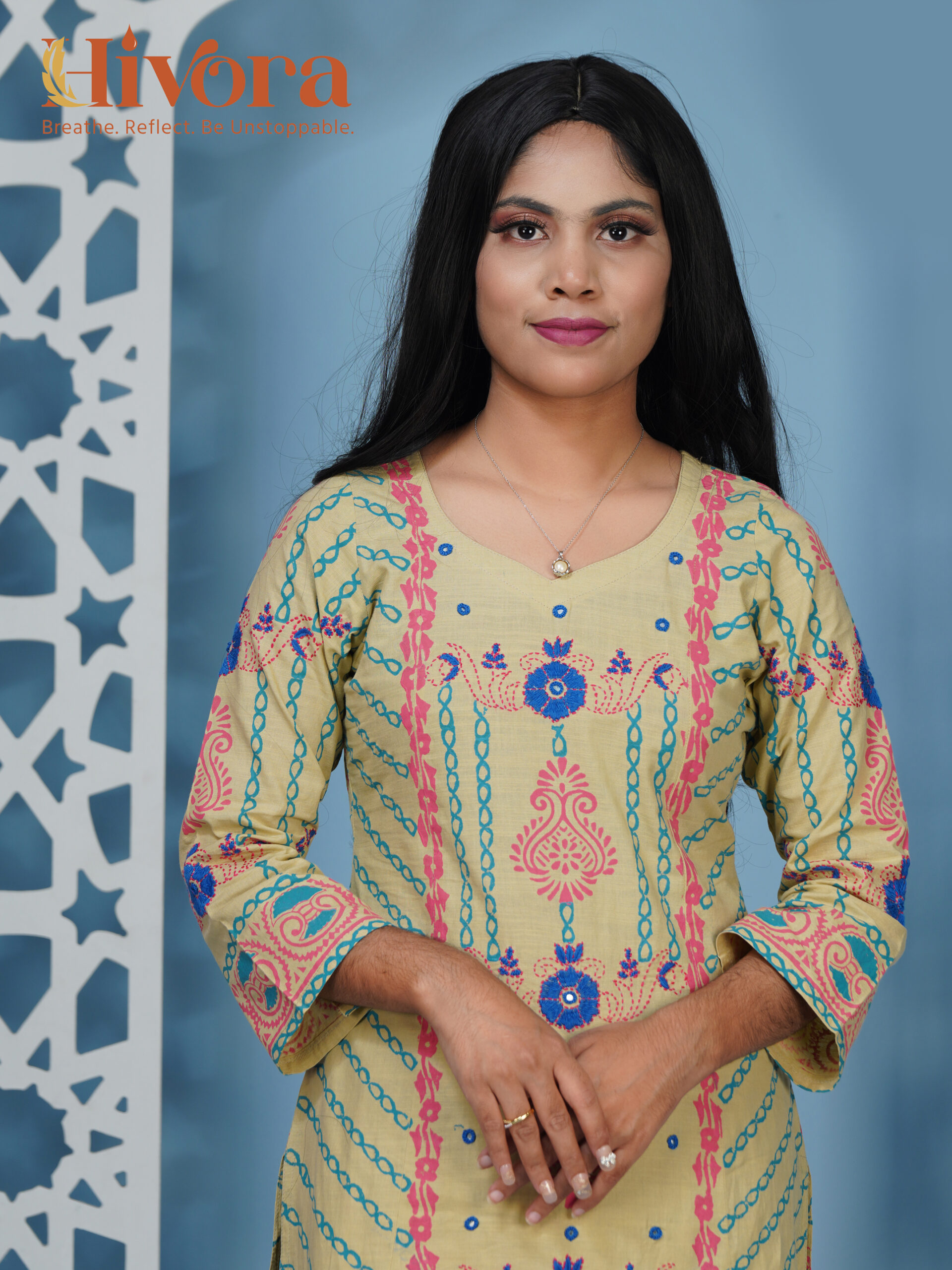 Value addition:-Â Kamiz block print with hand embroidery and dollar work.