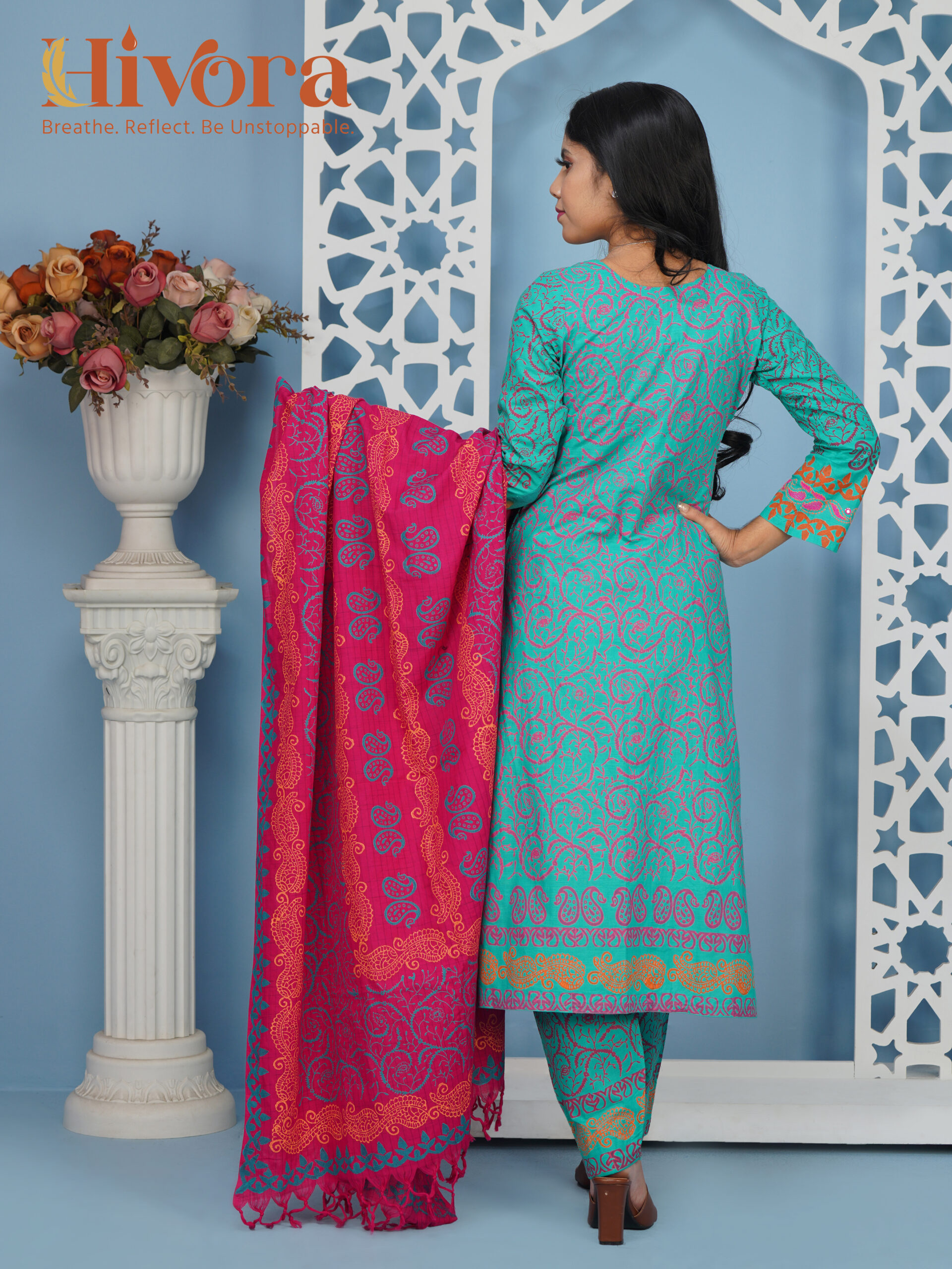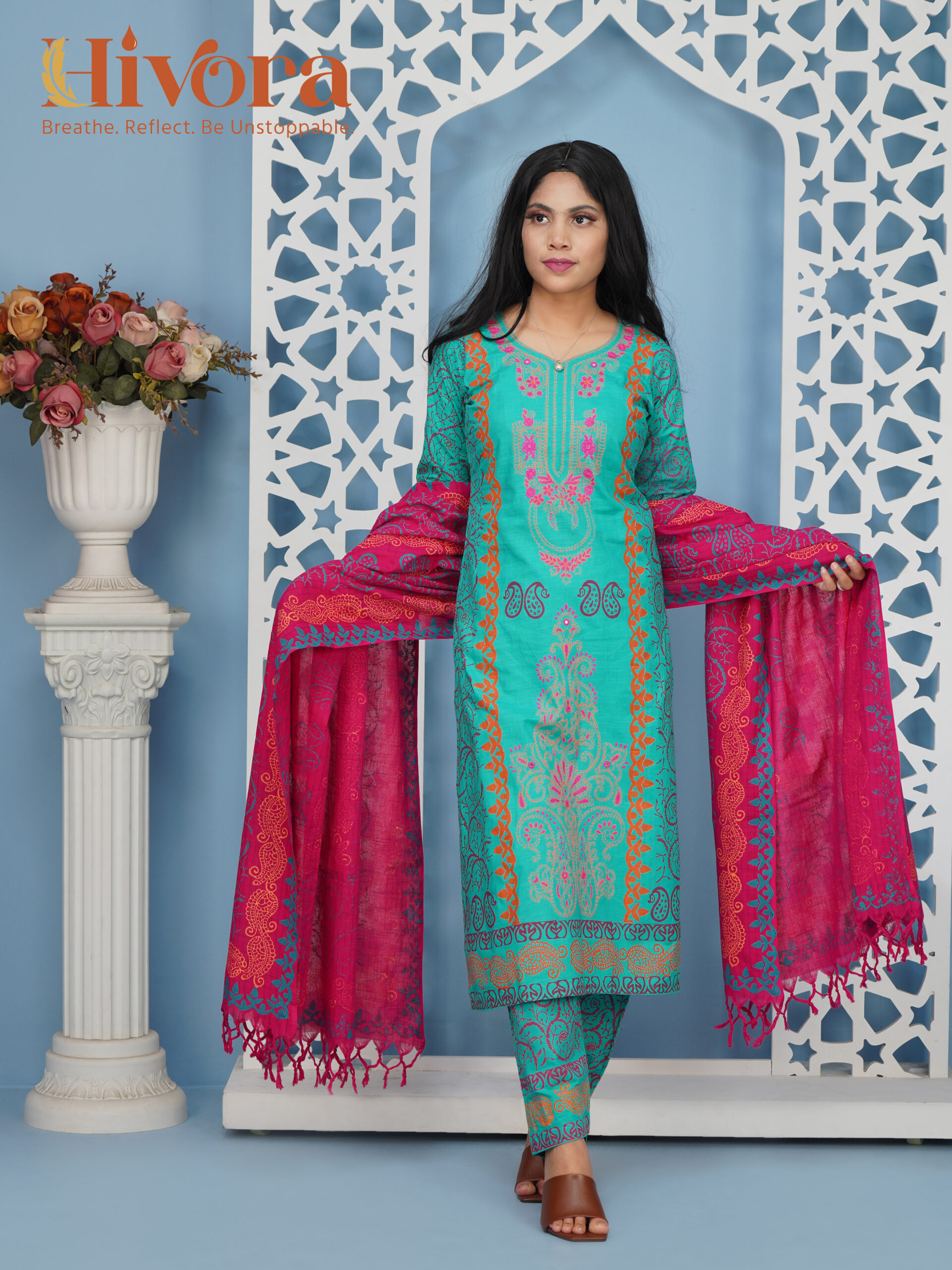 Value addition:- Kamiz block print with hand embroidery and dollar work.