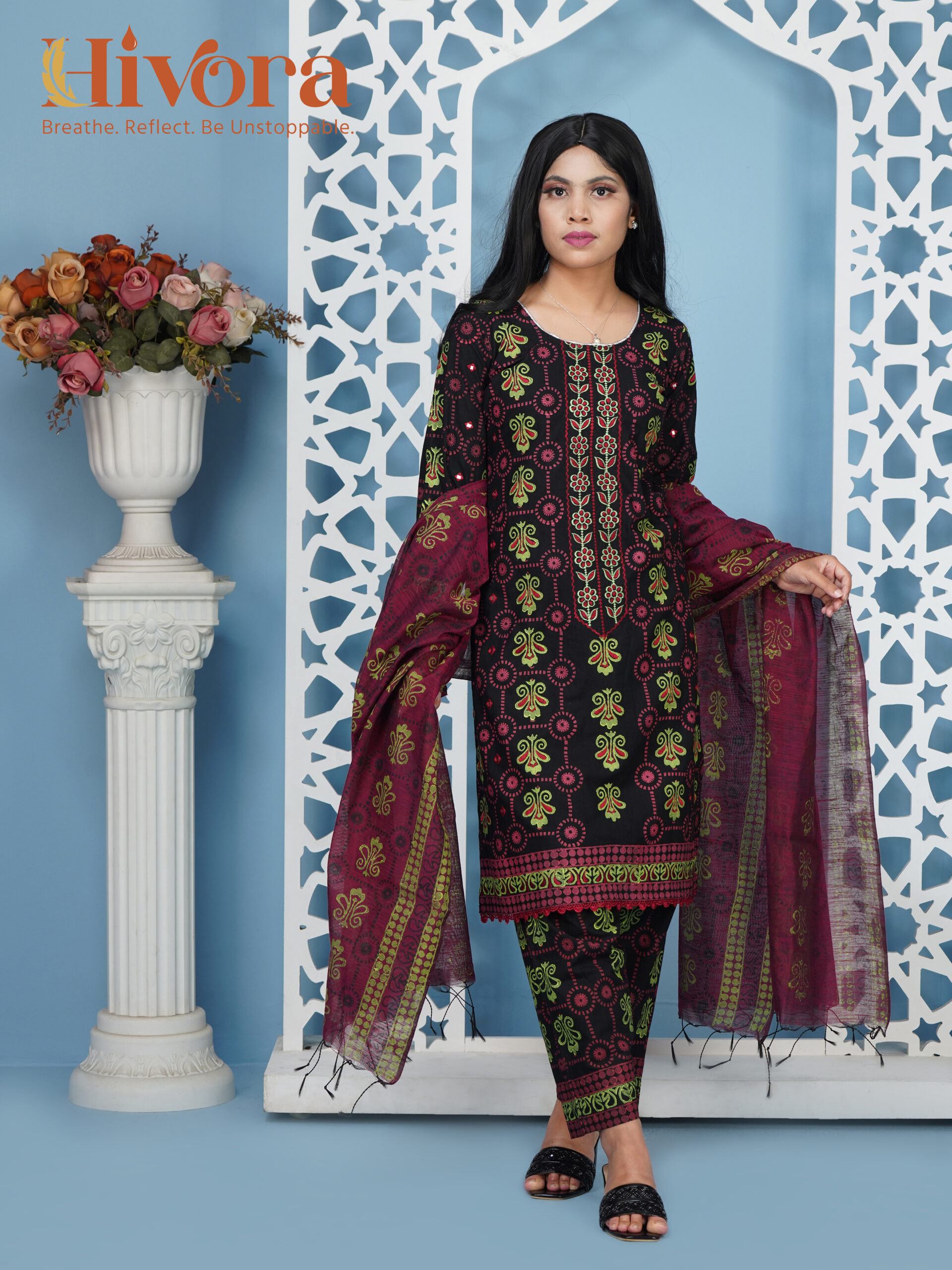 Value addition:- Kamiz block print with embroidery and dollar work.